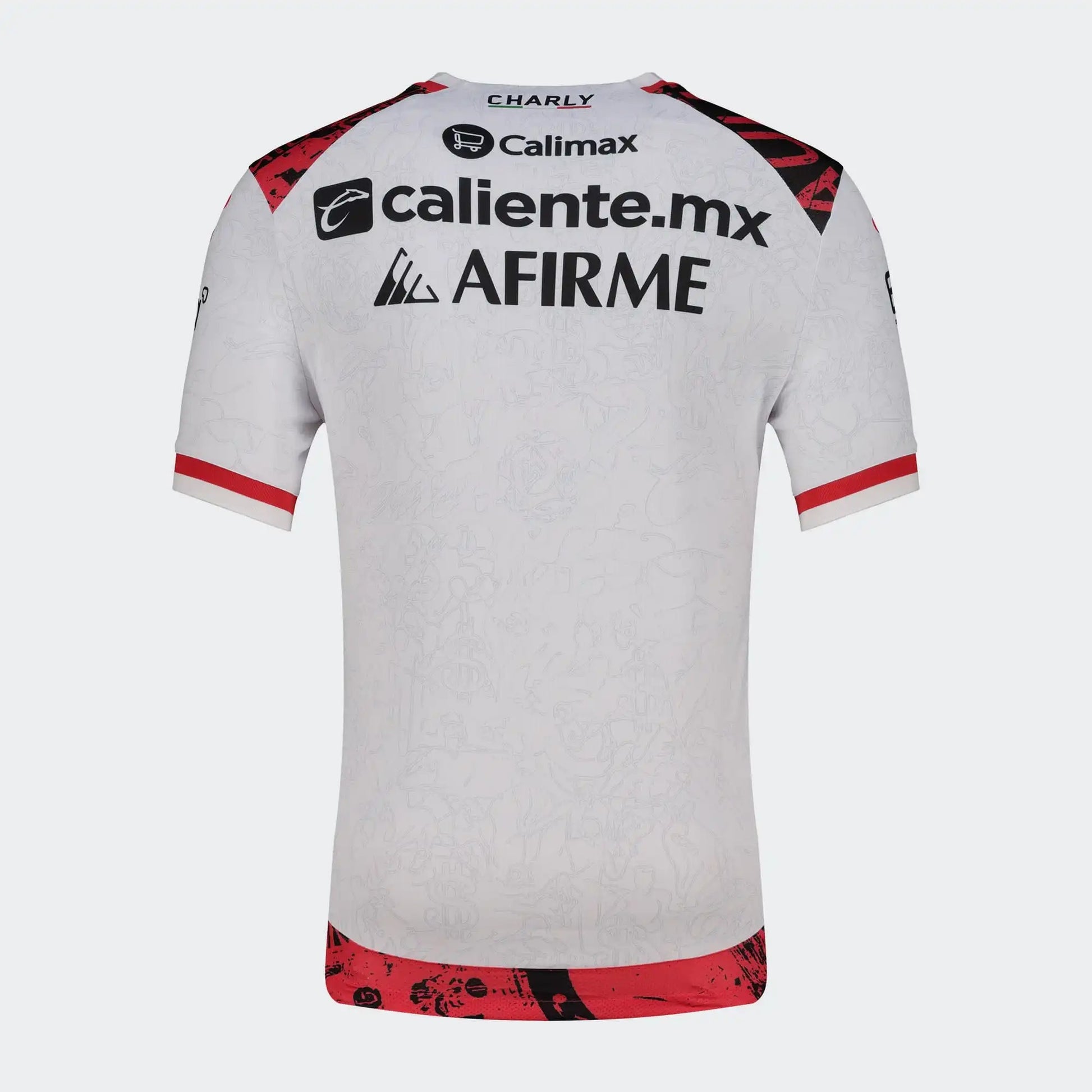 Wear the colors of La Jauría with the Xolos Away Jersey for Men 25-26, a garment that pays homage to the urban symbols and border identity of Tijuana. With a design that fuses sports and culture, this jersey is a statement of pride, passion and style both on and off the field. The jersey features a white design, contrasted with red mesh side panels that enhance ventilation and add a dynamic visual touch. The V-neck and sleeves with white and red rib give it a clean and modern finish. The traditional Club Tijuana crest in silicone transfer stands out in great detail, reaffirming your loyalty to the Xolos. As a nod to the club's urban roots, the design includes elements representative of the casino, such as the number 333, considered a key within the team. In addition, it incorporates a mesh graphic with an urban style print that matches the design of the home jersey, using a red base with white details to reinforce the visual link between the two versions. Made of 100% soft-touch polyester, it incorporates DRY FACTOR technology, which will keep you dry for longer, ensuring extra freshness before, during and after each activity or workout thanks to its specialized moisture transfer fabrics. UV Block technology offers protection against ultraviolet rays, ideal for outdoor workouts or matches, while Nano Guard fights bacteria that cause unexpected odors, ensuring freshness for longer. Carry with you the indomitable spirit of Tijuana. A design with history, attitude and a lot of soccer.