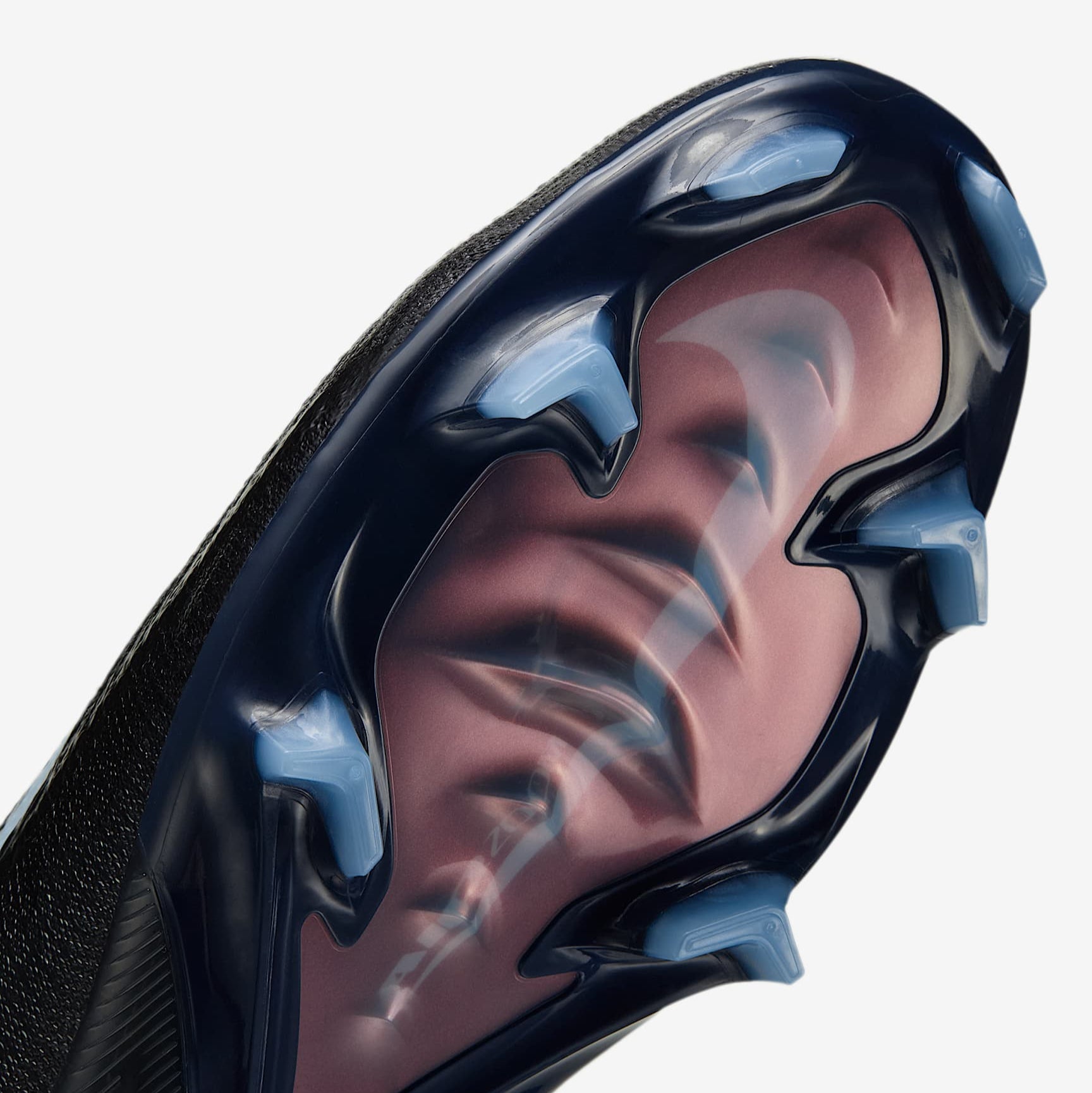 The wave-like traction pattern is a series of cascading studs, so it engages more surface area of the Air Zoom unit while also providing the appropriate amount of grip. The biggest stud is the same height as our traditional middle studs, so traction is not compromised. We paired the wave-like traction with evolved chevron and blade studs to help you stop when making quick cuts.